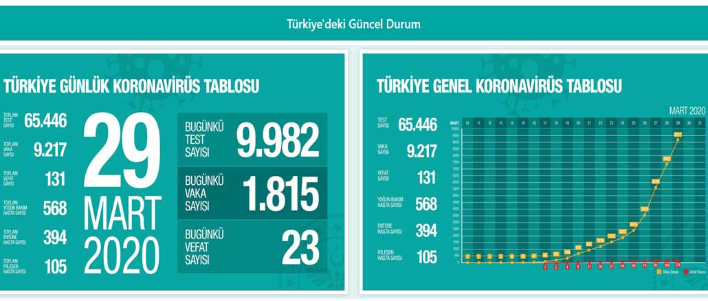 Turkin terveysministeri Fahrettin Koca:n mukaan Turkin koronavirus potilaiden määrä on noussut yhteensä 9217. Tänään on todettu lisää 1815 tapausta ja 23 henkilö on menehtynyt. Yhteensä menehtyneiden määrä on 131. Yhteensä 105 potilasta on kotiutunut sairaaloista toipumisen jälkeen tappavasta viruksesta. Tänään on tehty 9982 testiä.