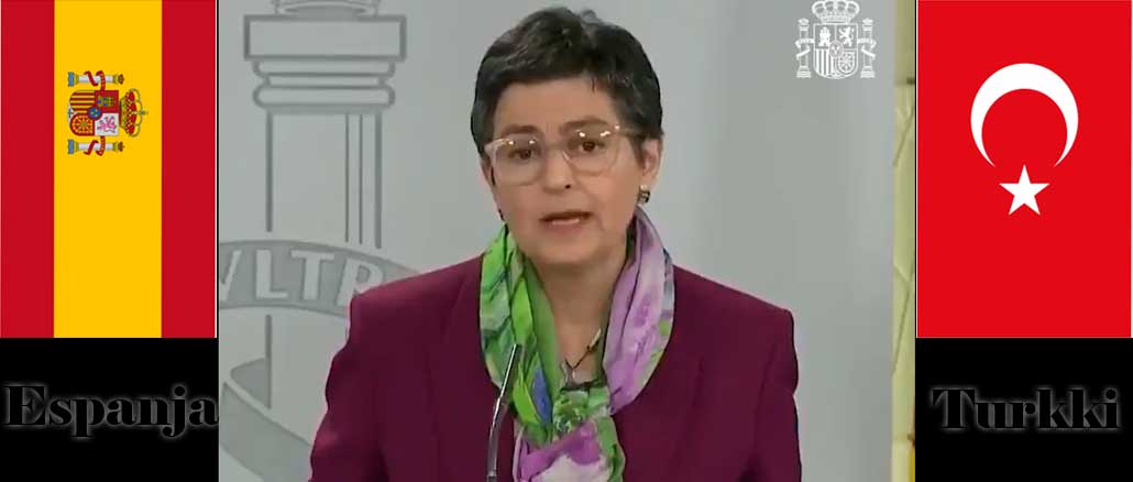 Espanjan ulkoministeri ”torjuu voimakkaasti” kaikki Turkkia vastaan esitetyt syytökset tässä asiassa. Espanjan ulkoministeri Arancha Gonzalez Laya kiitti lauantaina Turkkia toimitusluvan antamisesta lääkintähuolto laitteille jotka Espanja osti koronaviruksen puhkeamisen keskellä.