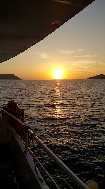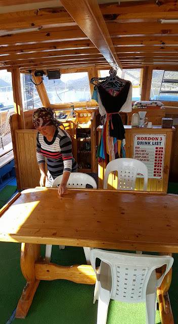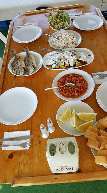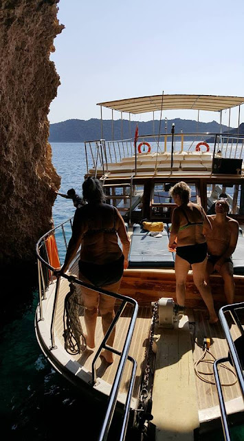 Kipparin vaimo toimii sekä puosuna, että kokkina. Snorklaamme kirkaissa vesissä. Bongaamme trumpettikaloja ja isoja pikkukalaparvia, jotka kerääntyvät erityisesti veneen alle. Ruuhkaa ei ollut. Vain muutamia turkkilaisia matkailijoita, Eurooppalaiset on peloteltu. Laitoinkin houkuttelevia facebook-kuvia ystäville ilmoittaen, ettei tänne Turkkiin kannata misään tapauksessa tulla. Tietenkin ymmärrämme Turkin elävän vaikeaa aikaa, mutta nyt tämä kaikki oli vain meitä varten.