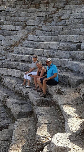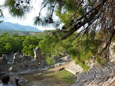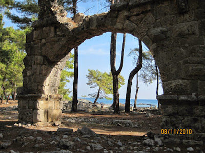 Paluumatkalla on tarkoitus näyttää ystävillemme erityisesti antiikin kaupunkia Phaselista, jossa vierailemme nyt kolmatta kertaa. Päätie on laskeutunut niin paljon vuorilta alas, että solahdamme lähes tasaista reittiä varjoisaan kolme satamaa käsittävään antiikin kaupunkiin. Phaselin historiassa mainitaan paikallisen paimenen myyneen niemen, jolla kaupunki nyt sijaitsee, Rhodoksella asuville kreikkalaisille 700-luvulla eaa. Sijainti on hyvä.