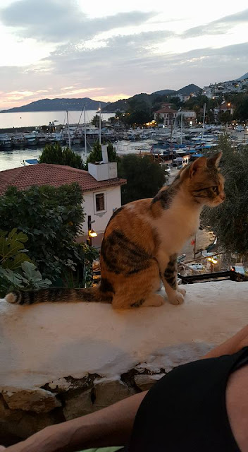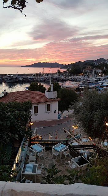 Pari kivenheittoa ja olemme satamassa, jossa on kymmeniä Gulet- ja kalastusveneitä. Purjeveneiden paikka on kauempana pitkän lahden pohjukassa. Satama, rantabulevardi ja siitä kiipeävät kapeat kujat kauppoineen ja ravintoloineen lumoavat varsinkin iltavalaistuksessa. Kissat ja koirat kulkevat vapaasti ihmisten joukossa. Ataturkin patsas kuuluu asiaan. Pojat potkivat palloa. Pienemmät ajavat pyörillään. Kauppiaat suhtautuvat rauhallisesti ikkunoita katseleviin.