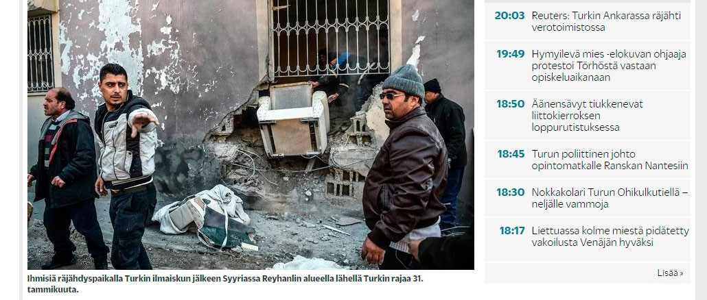 Tällainen tuli vastaan. Miksi Turun sanomat kirjoittaa tämän kuvan tekstissä ”Ihmisiä räjähdyspaikalla Turkin ilmaiskun jälkeen Syyriassa Reyhanlin alueella lähellä Turkin rajaa 31. tammikuuta.” Kuva on Reyhanista Hatayn maakunnasta joka sijaitsee Turkin Valtion puolella rajaa ja ilmaisku on tehty Syyriasta! Pikkasen pitäisi tarkistaa asioiden oikeellisuutta.
