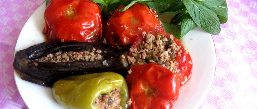 Sen jälkeen tulevat viininlehti- tai kaalikääröt, ja täytetyt tomaatit päällimmäiseksi.