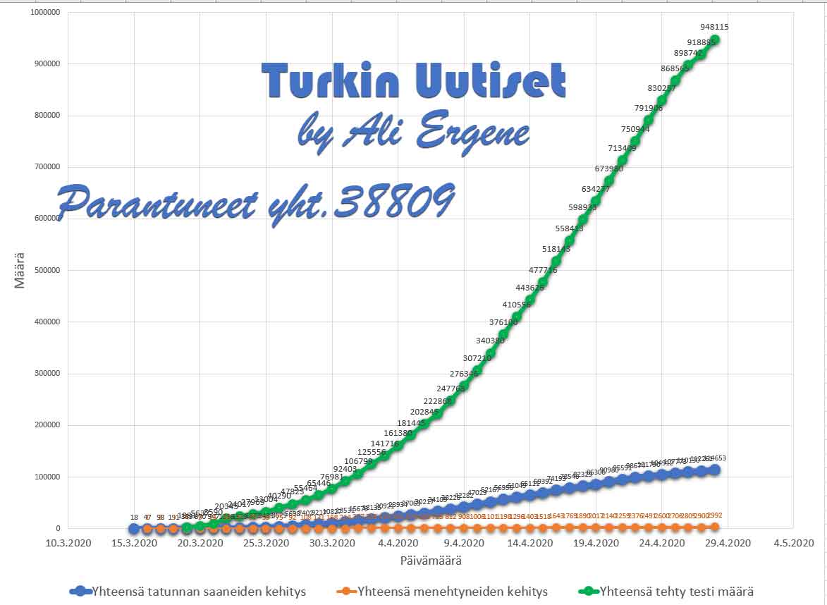 Turkin terveysministeri Fahrettin Koca mukaan Turkin koronavirus potilaiden määrä on noussut yhteensä 114653. Tänään on todettu lisää 2392 tapausta ja 92 henkilöä on menehtynyt. Yhteensä menehtyneiden määrä on 2992. Yhteensä 38809 potilasta on kotiutunut sairaaloista toipumisen jälkeen tappavasta viruksesta. Tänään on tehty 29230 testiä.