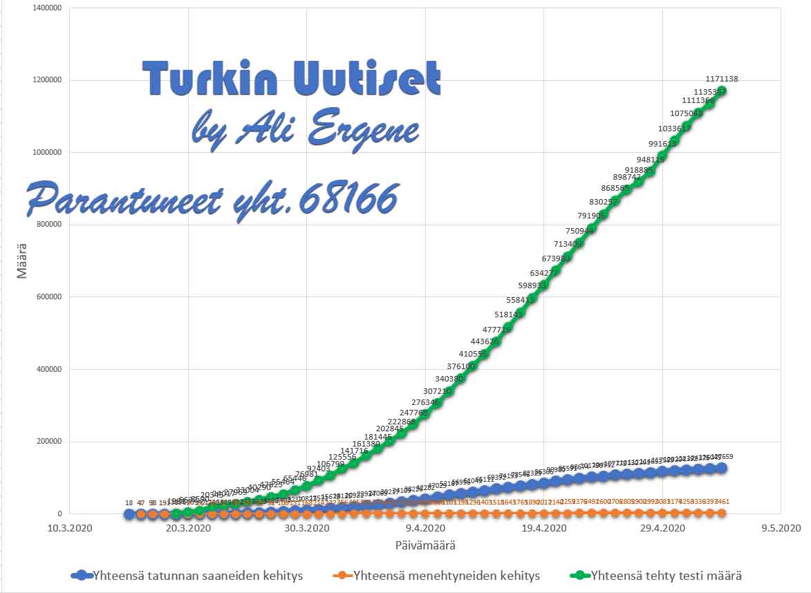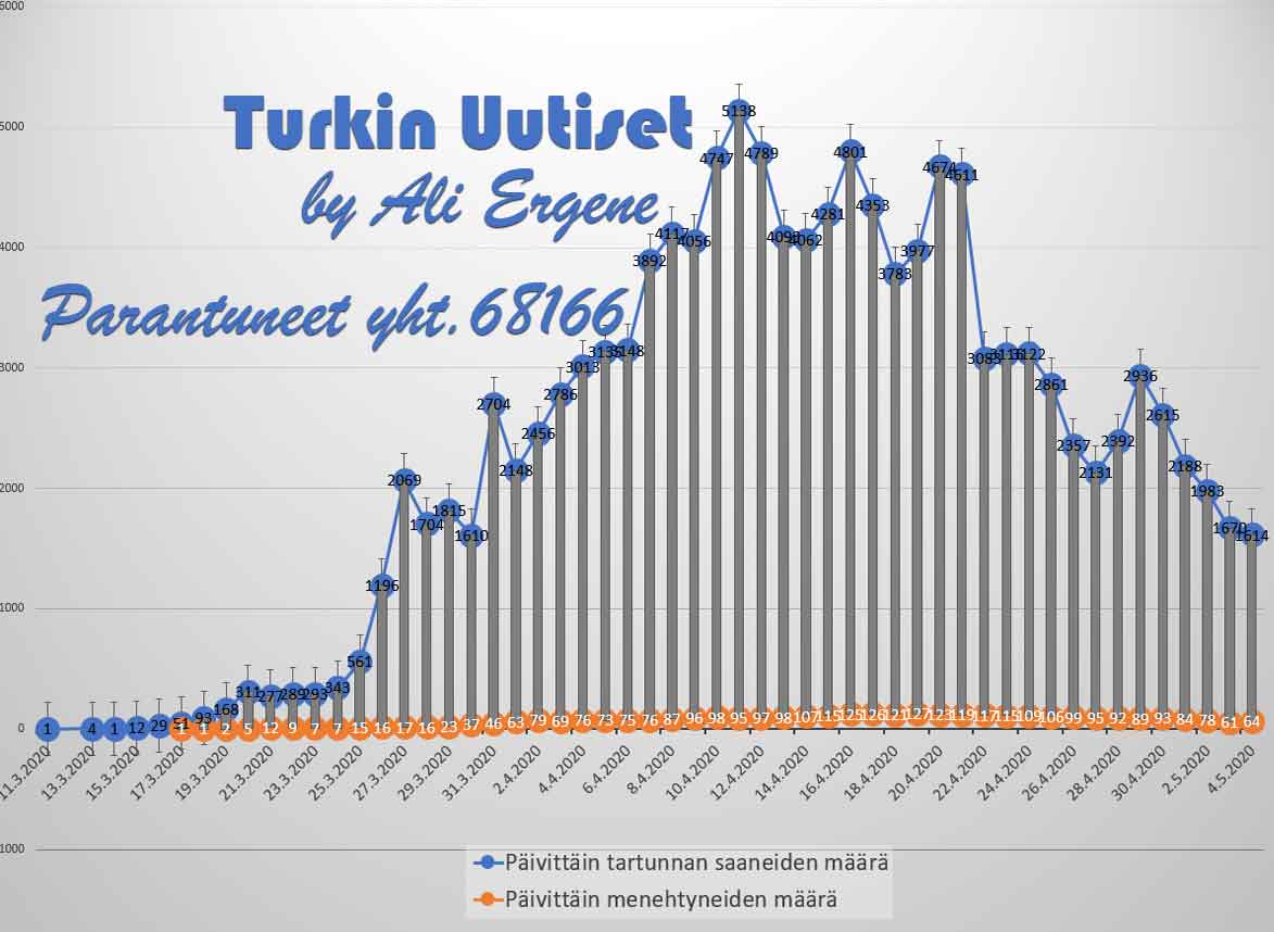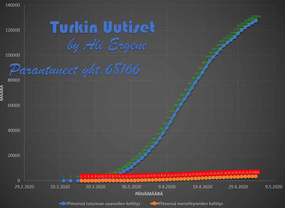 Turkin terveysministeri Fahrettin Koca mukaan Turkin koronavirus potilaiden määrä on noussut yhteensä 127659. Tänään on todettu lisää 1614 tapausta ja 64 henkilöä on menehtynyt. Yhteensä menehtyneiden määrä on 3461. Yhteensä 68166 potilasta on kotiutunut sairaaloista toipumisen jälkeen tappavasta viruksesta. Tänään on tehty 35771 testiä.