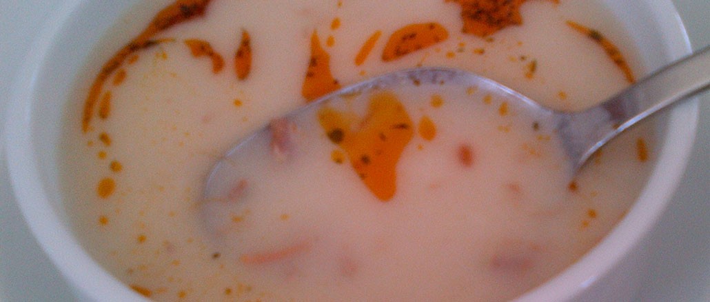 - Pienennä lämpöä kattilan alla ja kaada jogurttiseos lihaliemeen jatkuvasti vatkaten.